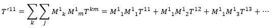 Als je dit uitschrijft, dan zie je dat elke nieuwe component weer een lineaire combinatie van de oude componenten is. De nieuwe 11-component van de tensor wordt bijvoorbeeld