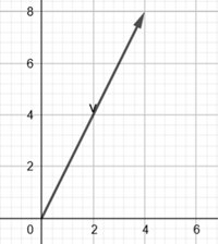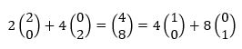 Het coördinatenstelsel definieert twee zogenaamde basisvectoren. Elke vector in het vlak kan als een combinatie van deze twee basisvectoren worden geschreven. Het feit dat we daarvoor twee basisvectoren nodig hebben laat ons zeggen dat het vlak tweedimensionaal is. Laten we voor het gemak de basisvectoren kiezen als e1 = (2,0) en e2 = (0,2). Vervolgens kunnen we de componenten van de vector bepalen in dit stelsel. Je ziet in dit plaatje dat de vectortop (x,y) coördinaten gelijk aan (4,8) heeft, zodat V = 2e1 + 4e2. We zeggen dat de componenten van de vector in dit coördinatenstelsel gelijk zijn aan (2,4): 2 stapjes in de e1 richting en 4 stapjes in de e2 richting.