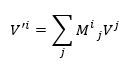 waarbij de haakjes in de basisvector e(i) aangeven dat de i-index hier een hele vector labelt, en niet slechts een component ervan. Omdat de vector V niet maalt om onze coördinatenkeuze, moet na een transformatie gelden dat