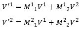 De komma stelt het nieuwe coördinatenstelsel voor. De matrix M beschrijft de transformatie en wordt bepaald door hoe je de basisvectoren precies verandert. De componenten van de vector zullen dan tegengesteld veranderen. Dat volgt uit onze eis dat de vector V zelf ongemoeid blijft na de transformatie. Bij de transformatie heffen de verandering van de vectorcomponenten en de verandering van de basisvectoren elkaar op zodat de vector hetzelfde blijft. Wiskundig: de basisvectoren transformeren met de inverse van M en de vectorcomponenten met M zelf, zodat de vector V als geheel invariant blijft.