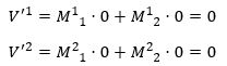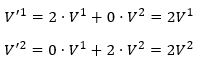 Je ziet: de nieuwe componenten V‘i zijn lineaire combinaties van de oude componenten Vi. In het bijzonder zie je dat als je de nulvector neemt (de vector waarbij elke component nul is) en deze vervolgens in het nieuwe stelsel bekijkt, de nieuwe componenten ook nul zijn: